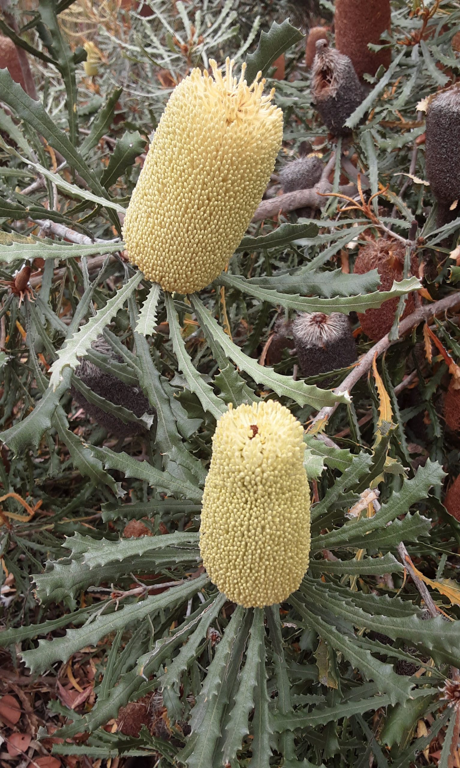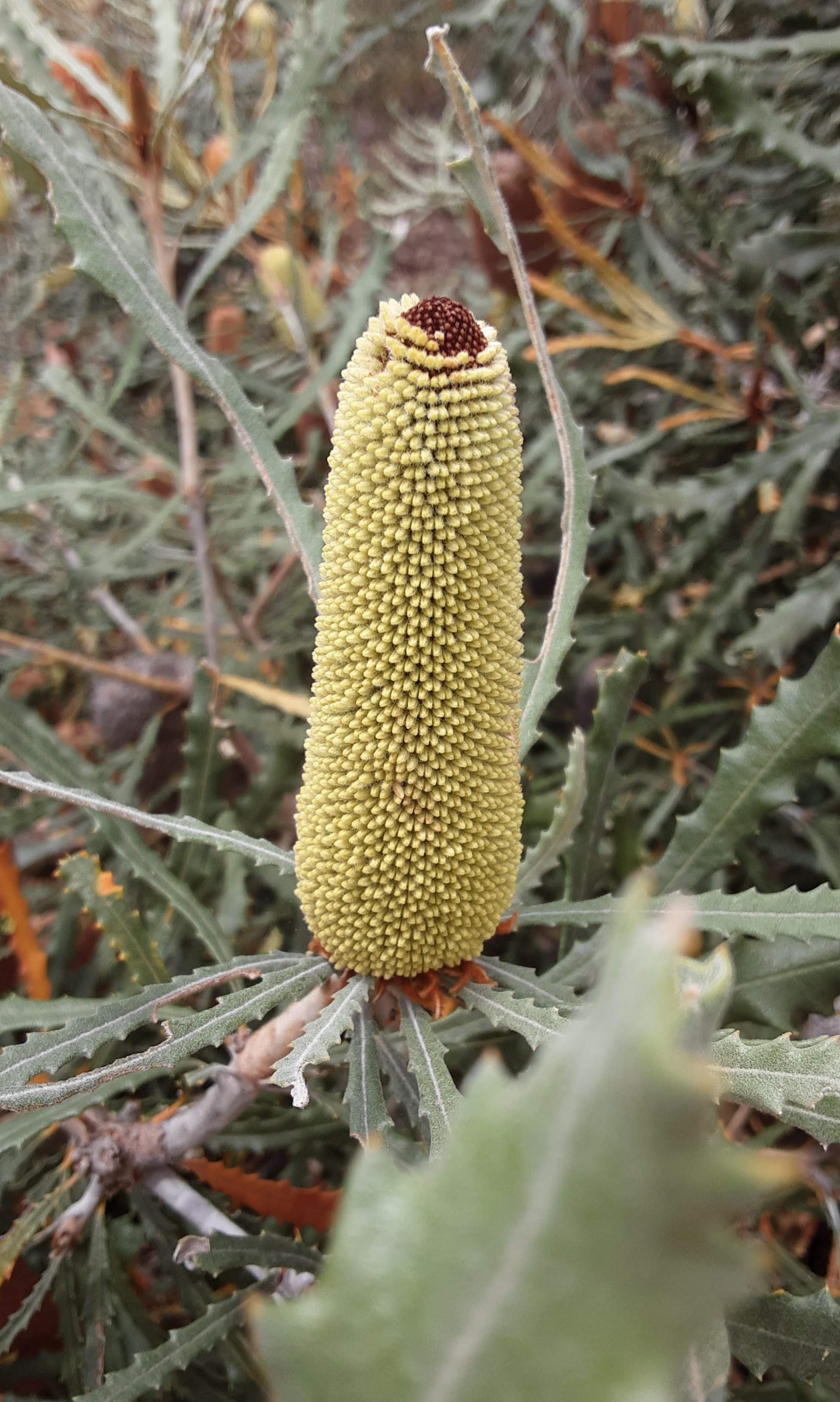 Banksia pilostylis is a bushy shrub 2-4m x 2-3m. Serrated leaves and large cream or greeny yellow cones Spring, Summer and Autumn. Sunny to partly shaded position. Tolerant of light frost and coastal conditions.