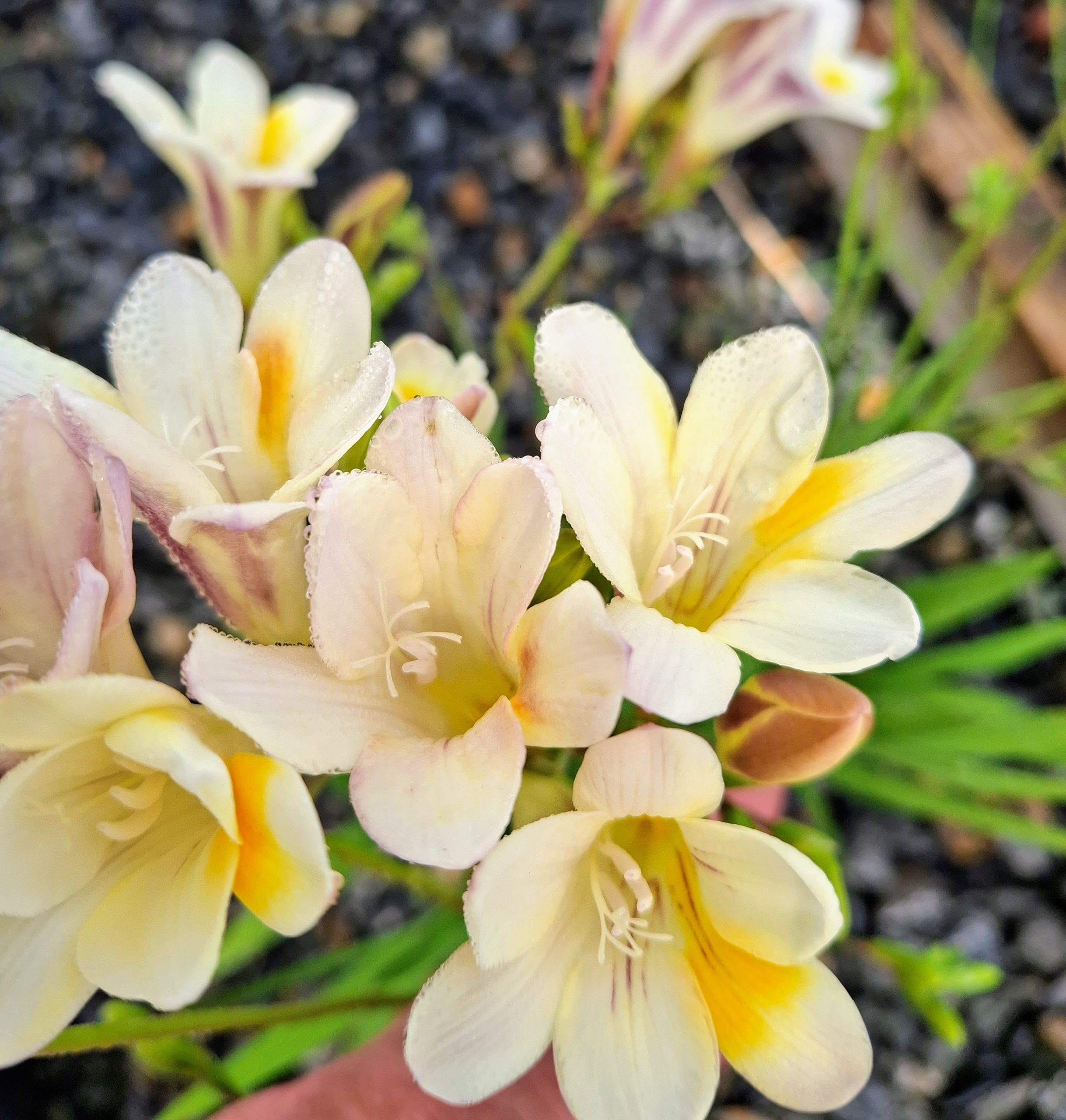 Flowers white to cream-coloured, with yellow markings, shaded purple on outer surface of tube, sweetly scented. Good drainage essential. Multiplies rapidly and produces plenty of seed.