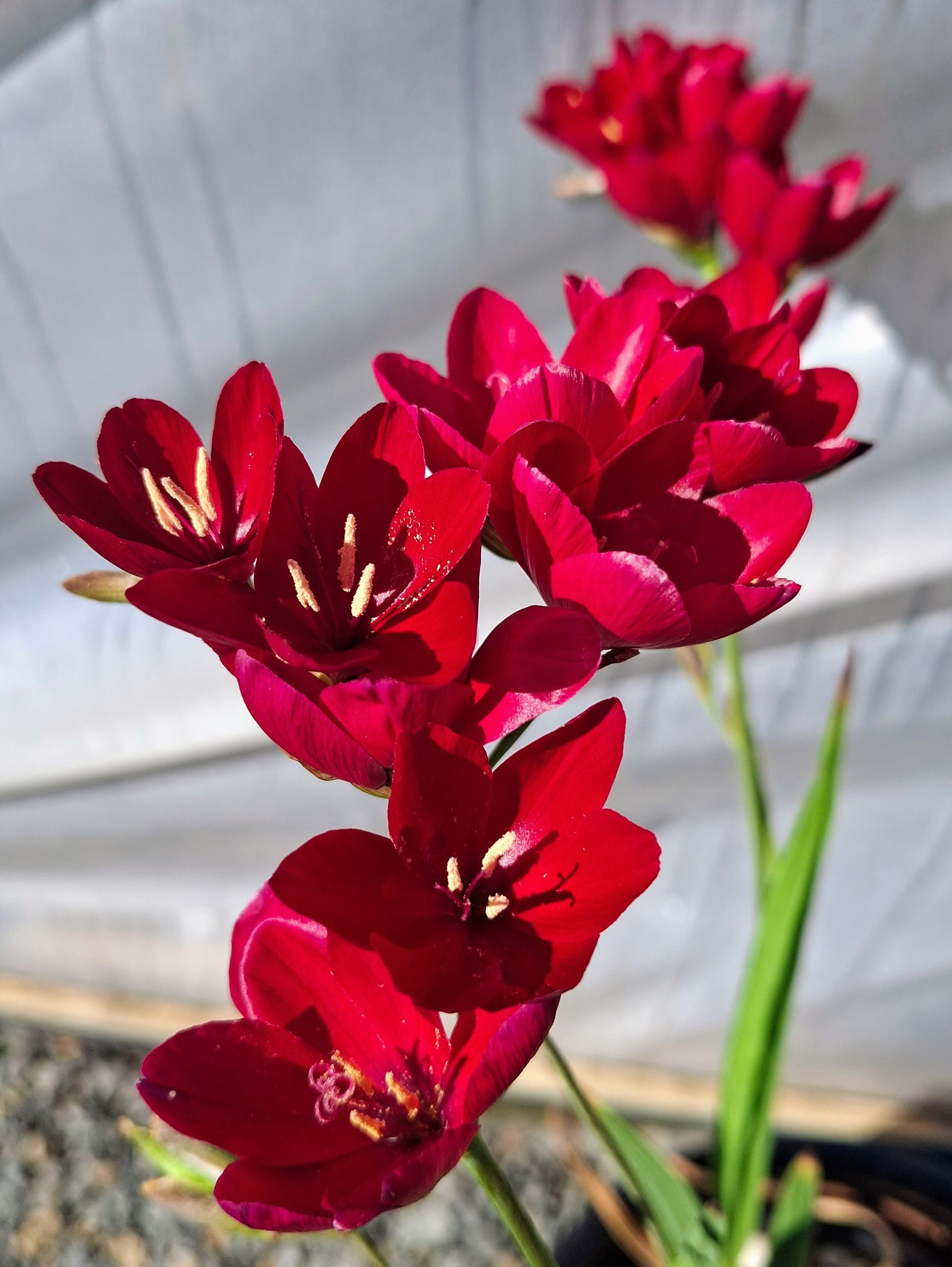 South African bulb typically growing 15-20cm in height. Eye catching red flowers with dark centres in spring. Good drainage essential. Multiplies slowly but produces plenty of seed.