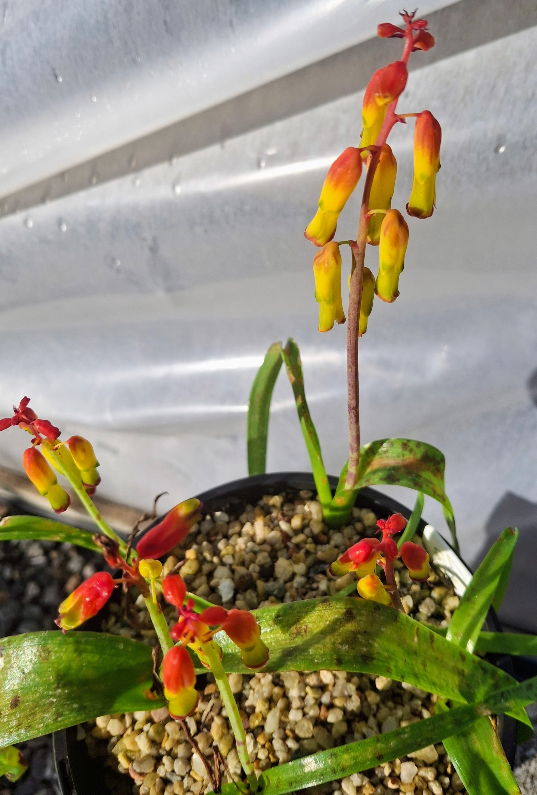Easy to grow South African bulb growing 15–28 cm tall by 5 cm wide, with strap-shaped leaves and fleshy stems bearing pendent tubular yellow and red flowers in winter and spring. Good drainage required.